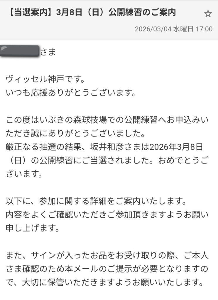 2026年3月4日(水)17:00、ヴィッセル神戸から当選のメールが届きました。