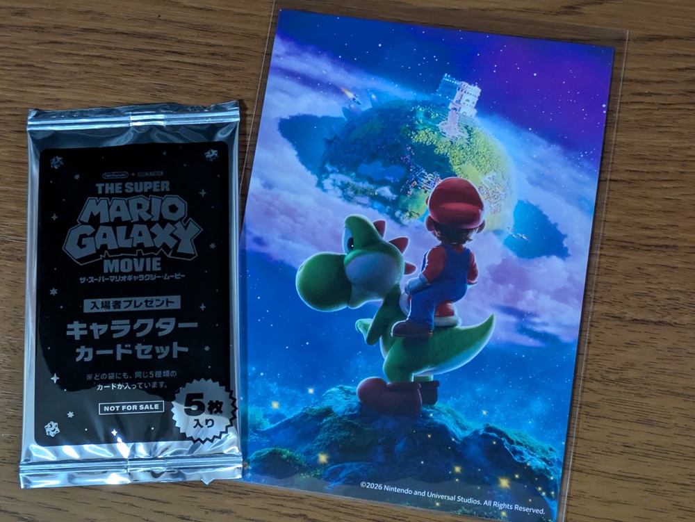 あわせて配布されていたポストカード(マリオがヨッシーの背中に乗って惑星を見つめるあのビジュアル)も最高でした。部屋に飾る用に保管確定です。