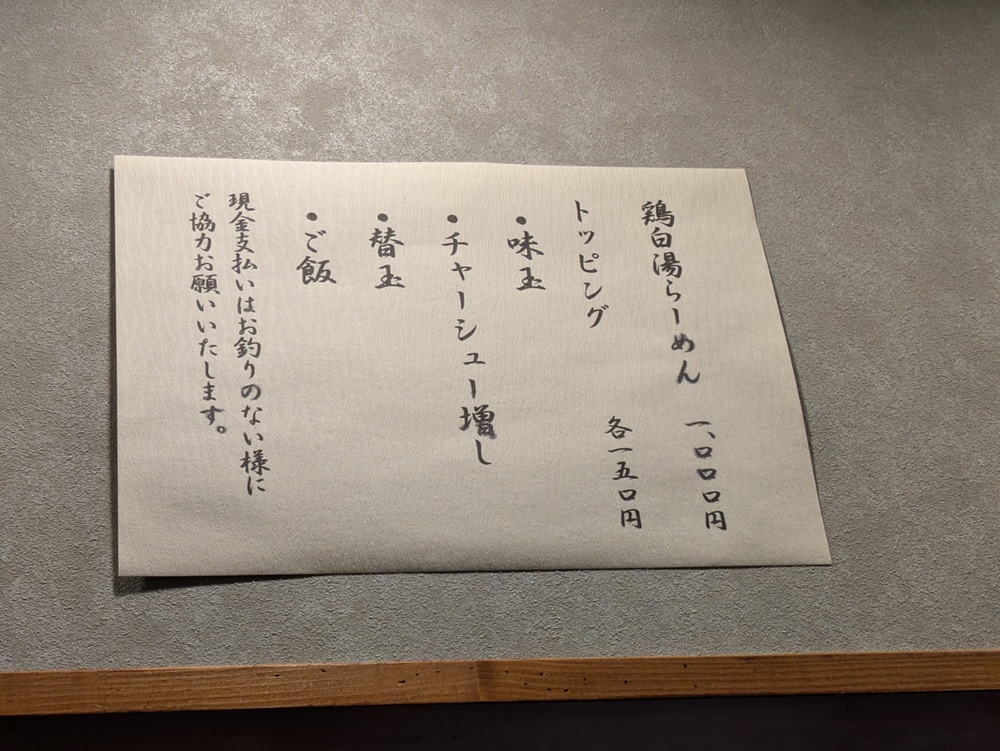 迷う必要なし。とにかく鶏白湯らーめん(1,000円)一択です。 トッピングは 味玉・チャーシュー増し・替玉・ご飯 がそれぞれ150円で追加可能。