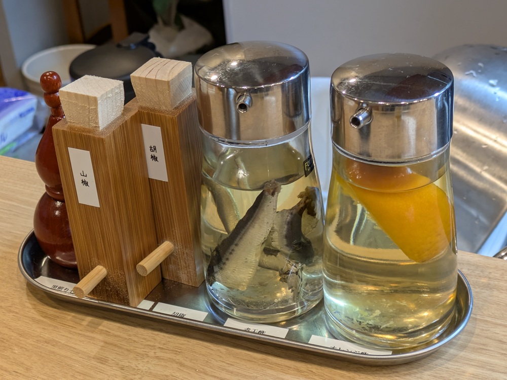 カウンターには 山椒・胡椒・自家製の調味料2種(魚介系と柑橘系っぽいやつ)が並んでました。