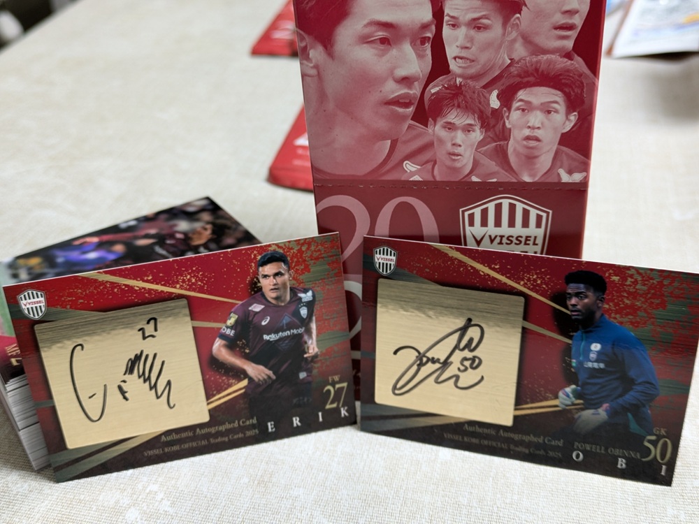 ちなみに、購入した 2025ヴィッセル神戸 オフィシャルトレーディングカード 1箱の開封結果は、エリキ選手とオビ選手のサインカード でした。